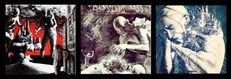 for å visualisere denne problemstillingen, med bygninger og sosiale systemer som symboliserer hvordan menneskeheten er i ferd med å miste sitt emosjonelle fundament.