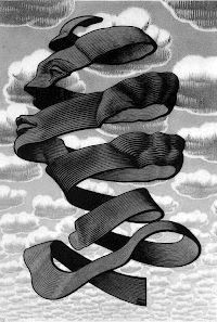 I think this is the first appearance of the swirling banner. In the back of my mind there must have been a reference to this MC Escher piece